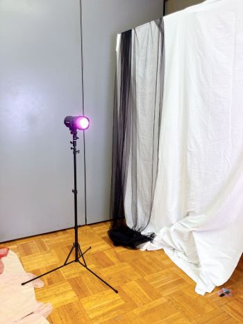 何もない会議室にこんなふうに布を入れて、ライトを立てればあっという間にスタジオに◎。