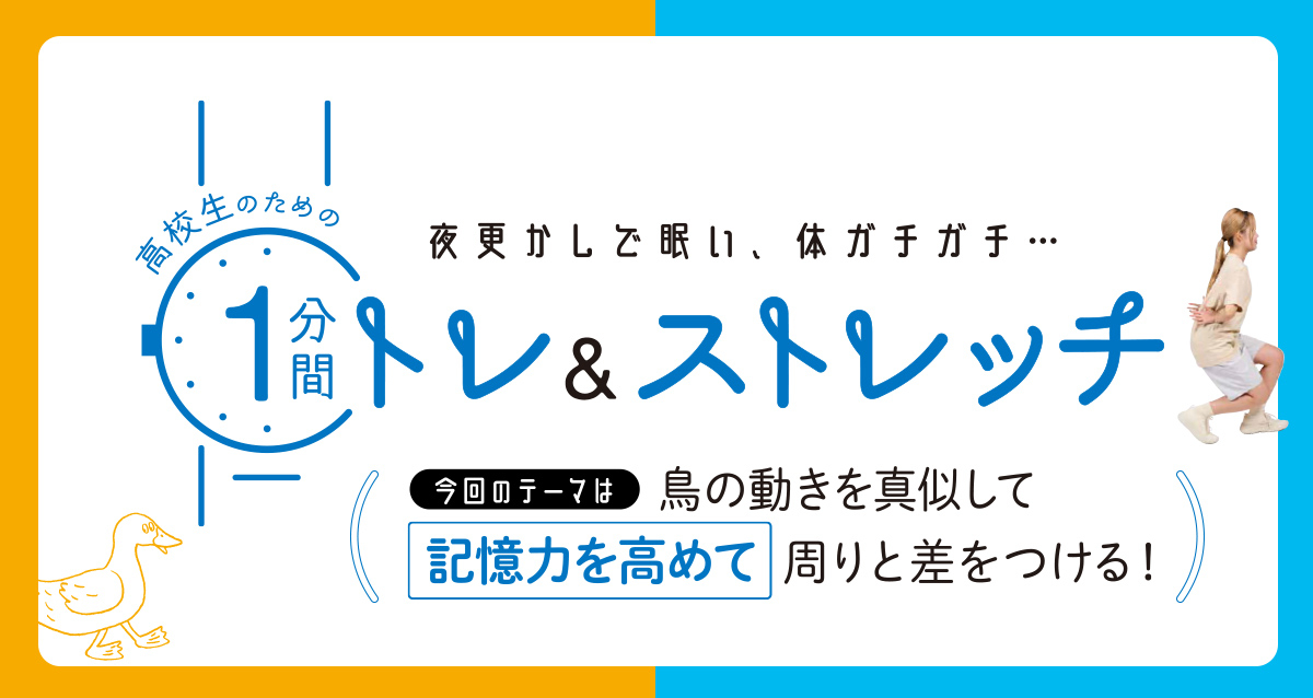 気持ちが煮詰まってテキストを読んでもなかなか頭に入らないとき、 鳥たちの動きを取り入れた運動で頭をスッキリさせよう。今回は記憶力を高めるための1分間トレ&ストレッチをそれぞれ紹介するよ。