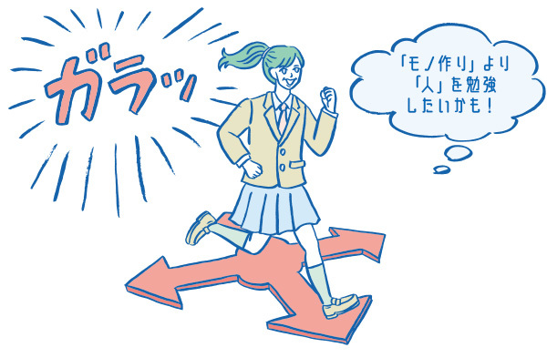 例えば、ものづくりをイメージして、ぼんやり工学部志望で理系を選択したものの、地元の商店街の活性化に興味が出てきた。そのため、社会学部か政策学部を志して文系に転じる、というようなケース。