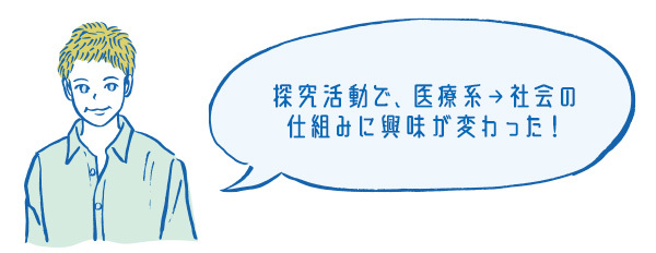 もともと医療系の進路を考えて理系を選びました。しかし、勉強を進めるうちに、「自分が本当にやりたいことは、人の体を治すことより、人の暮らしや社会を動かすしくみを考えることかもしれない」と感じるようになったのです。高校の探究活動で、地域の課題を調べる機会があり、政策や法律の面からアプローチすることに興味をもちました。高2の秋ごろから「法学部で社会のしくみを学びたい」と文転を考え始めて、先生や大学の文系学部に進学した先輩の話を聞き、高2の冬休みに文転を決断。