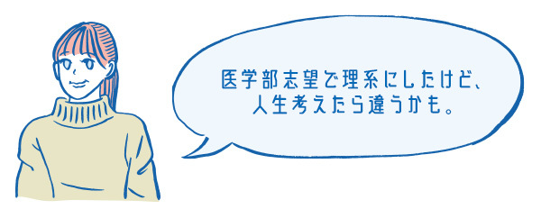 中学までは数学の成績が良くて、高校でもその調子でいけると思っていました。文理選択はとても悩みましたが、ひとまず理系を選択。しかし、数学でいきづまり、このまま理系クラスにいても成績が伸びず、思ったような大学に合格できないと考えるようになりました。