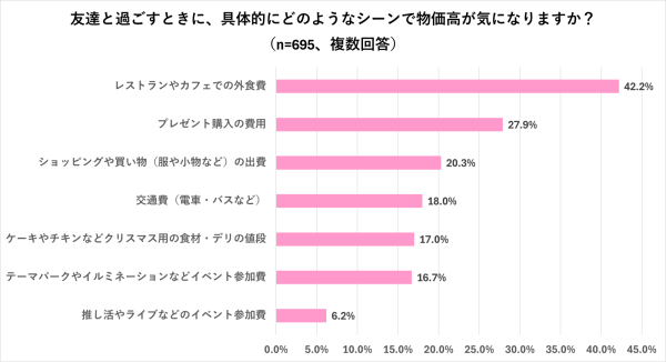 グラフを見ると、気になる人が半数以上、特に友達と過ごす際に“より”気になる人が多い結果に。具体的なシーンとしては外食費や交通費、ショッピングで使う予算などを気にかけている様子。