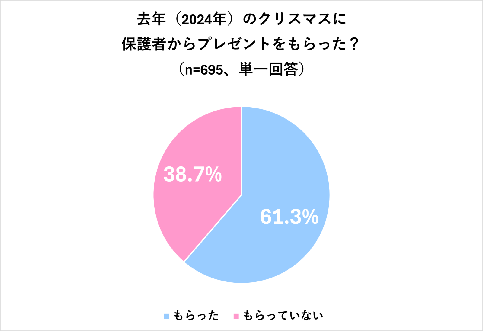2022年に実施した調査では2021年のクリスマスにプレゼントを「もらった人」が7割に近く、2023年に実施した調査では2022年のクリスマスにプレゼントを「もらった人」が6.5割、2024年に実施した調査では2023年のクリスマスにプレゼントを「もらった人」が6割だったので、2023年と2024年は同等の結果に。