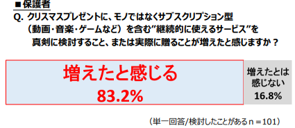 お財布事情が厳しくてもクリスマスは楽しく家族で過ごしたい!そんな想いで実施されている食事や飾りつけ等の工夫を聞いているうちに、今年改めて目についたのが「サブスク」の活用。モノではなくサブスクリプション型を含む“継続的に使えるサービス”を検討したことがある保護者の人に、真剣に検討もしくは実際にプレゼントすることが増えたと感じるかを聞くと、83.2%が「増えたと感じる」という結果に。