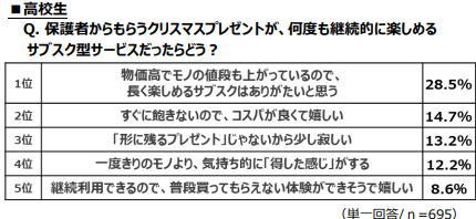 というのがサブスク検討の背景になっているよう。これに対し、高校生のみんなが「サブスク」のプレゼントをどう思うか聞いてみたよ!結果的に、TOP5のうち3位を除く=多くの みんながポジティブにとらえていることが明らかに☆