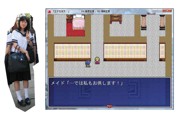 右)コンピュータ部で作ったRPG。お姫さまが誘拐された王子さまを助けに行くストーリー