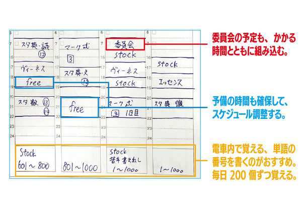 朝は前日の復習をしたうえで、その日のTO DOリストを作成。5教科受験だったので、それぞれの教科で学習計画を立てました。苦手科目を多めにすることがポイントです。